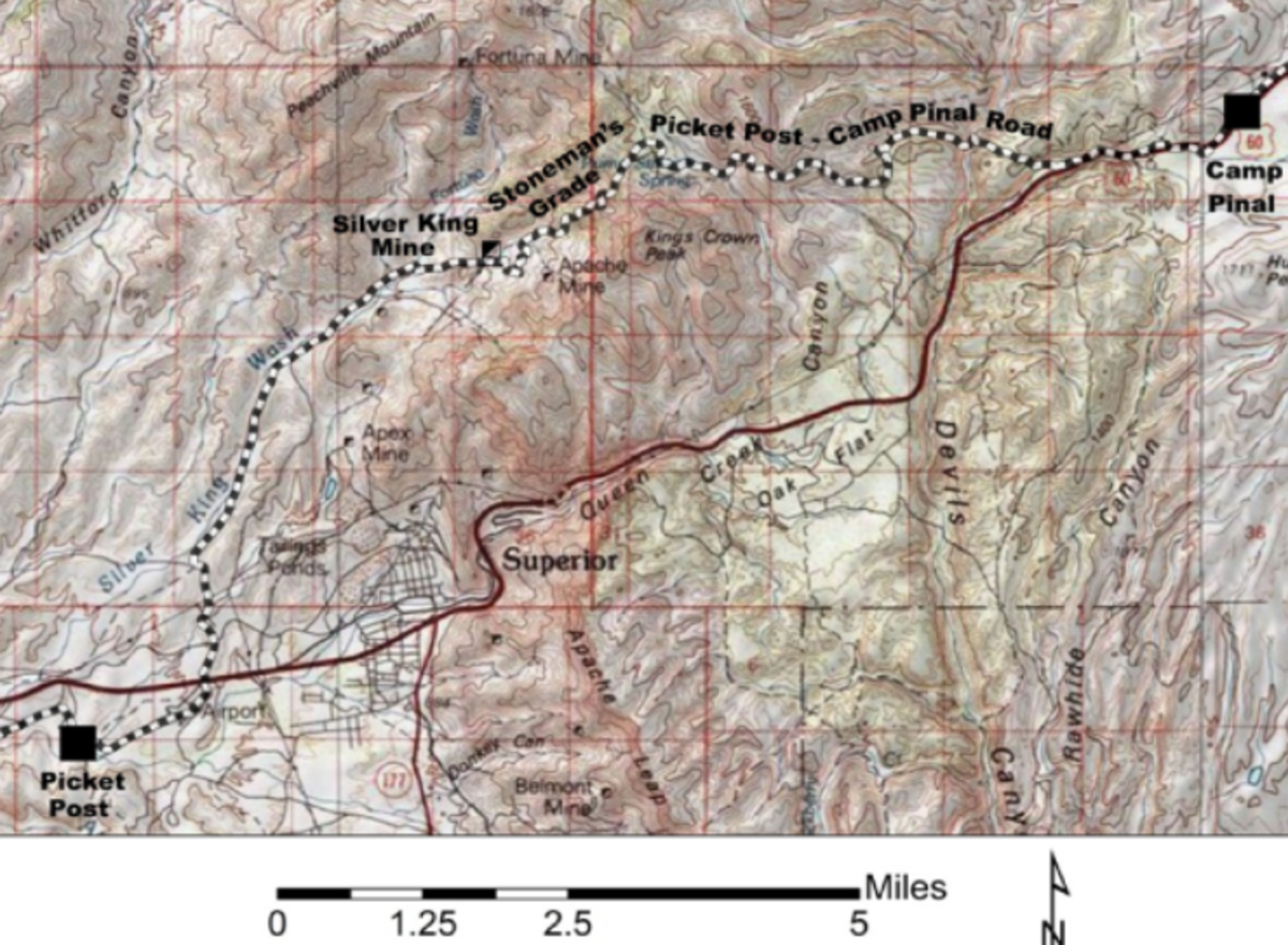 Located 6.5 miles north of Superior on Silver King Mine Rd, the history of the mine unfolds in a similar way to other mines in Arizona. A road known as Stoneman Grade was built with the aid of soldiers from Camp Picketpost; one of those soldiers remembered a black rock that could be easily flattened. John Sullivan, the observant soldier, tried to interest folks into mining the area but didn't divulge the nugget silver location. A number of interested parties wound up killed by Apaches before the location of the silver outcropping was discovered.